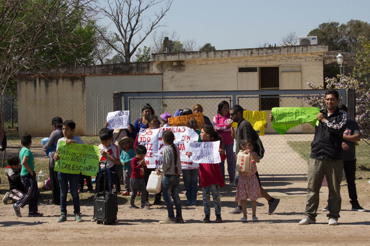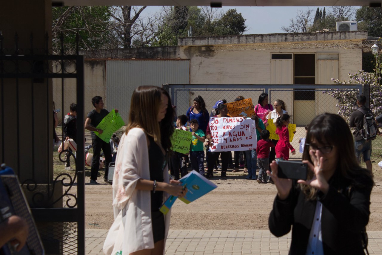 Frente a la sede del evento, vecinos/as de Malabrigo aguardaban con carteles para reclamar por la suspensión del servicio de agua potable en el asentamiento de calle 128. Lo hicieron con pancartas que recordaban que el 27 de septiembre también se celebra el Día Nacional de los derechos de Niños y Adolescentes, en alusión a los más de 30 infantes del lugar que están privados de este servicio básico desde hace tres días.