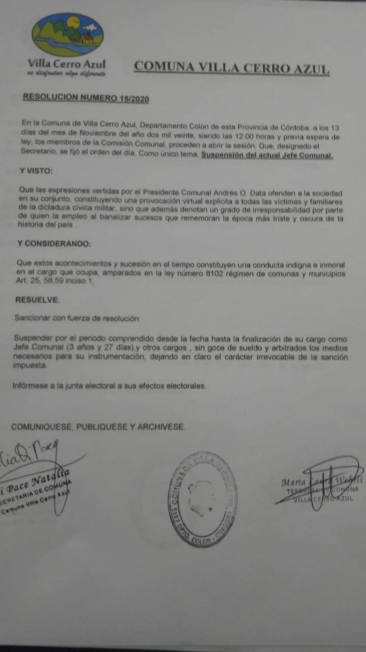 En sesión el 13 de noviembre, los miembros de la Comisión Comunal de Villa Cerro Azul resolvieron suspender de su cargo como Jefe Comunal a Andres Data por sus publicaciones en redes sociales realizando apología al terrorismo de estado. Vecinos autoconvocados exigieron una serie de puntos para la nueva comisión.