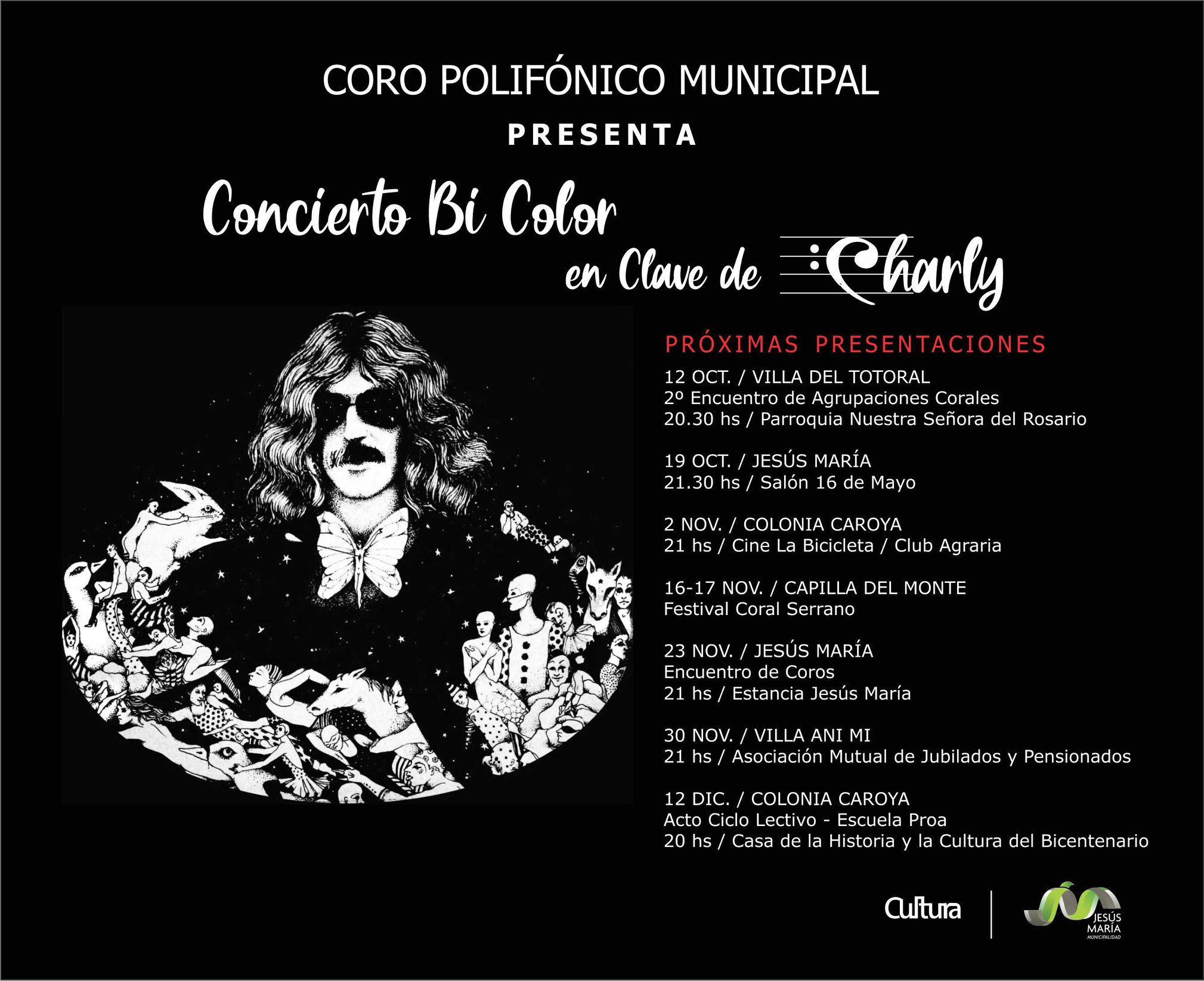 El Coro Polifónico Municipal de Jesús María presentará su “Concierto Bicolor, en clave de Charly” un espectáculo pensado como homenaje al músico del rock, Charly Garcia. Será el próximo sábado, desde las 21 horas en la sala del Agraria Cine con entrada libre y salida a la gorra.
