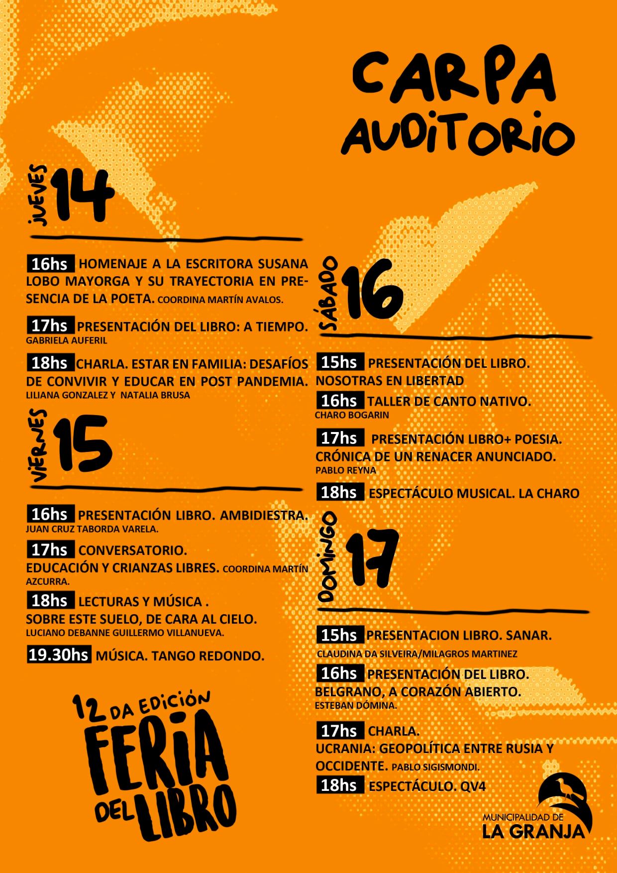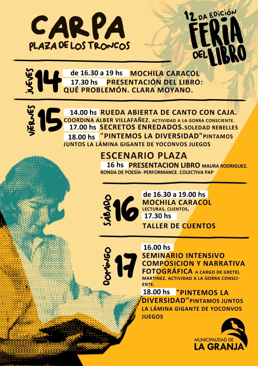 La 12° edición de la Feria del Libro de La Granja comenzará este jueves y se extenderá hasta el domingo con diferentes actividades literarias, artísticas y recreativas para toda la familia. La grilla se dividirá en dos carpas ubicadas en el parque municipal ubicado sobre la E-53.